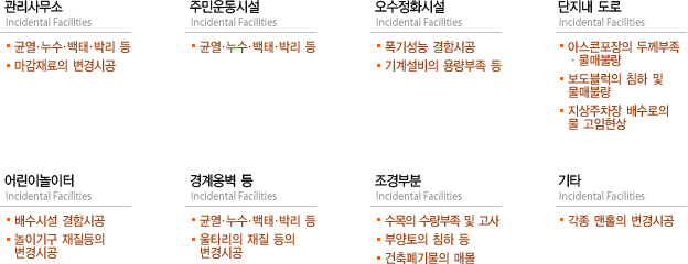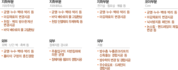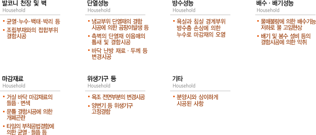 공동주택의 방수, 누수, 균열, 기타 건축물의 다양한 하자발생시 정확한 발생원인 규명을 통한 신속한 대처와 성실한 책임시공으로 쾌적한 주거환경을 조성합니다. 내 집을 고친다는 마음가짐으로 최상의 주거공간 제공을 위해 우수한 건축재와
