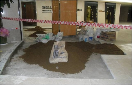 2층 식당앞 바닥 대리석 설치 작업중
